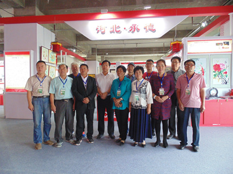 承德市文廣新局局長董宇、副局長馮寶忠與參展的承德企業代表在展館合影