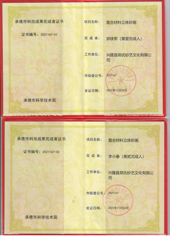 2021年11月24日,鄭氏砂藝圓滿(mǎn)完成了復(fù)合材料立體砂畫(huà)項(xiàng)目,獲得由承德市科技局頒發(fā)的《承德市科技成果證書(shū)》(市級(jí)登記號(hào):2021167),該項(xiàng)目課題來(lái)源于承德市科學(xué)技術(shù)研究與發(fā)展計(jì)劃,由我公司和北京機(jī)械工程學(xué)會(huì)材料分會(huì)共同完成。項(xiàng)目以天然彩砂和金屬絲為主要材料,畫(huà)面中加入其它復(fù)合材料(如山楂核、樹(shù)葉等),制成立體砂畫(huà),砂畫(huà)畫(huà)面采用透明樹(shù)脂壓膜技術(shù),保持彩砂畫(huà)面與膜不脫落,不褪色。通過(guò)該項(xiàng)目的研究,企業(yè)創(chuàng)新產(chǎn)品5個(gè)系列200多種作品,其中包括:砂畫(huà)木質(zhì)筆筒系列、水晶砂畫(huà)系列、砂畫(huà)手機(jī)殼系列、磁盤(pán)砂畫(huà)系列、活性炭砂畫(huà)系列,極大的提升企業(yè)產(chǎn)品質(zhì)量。