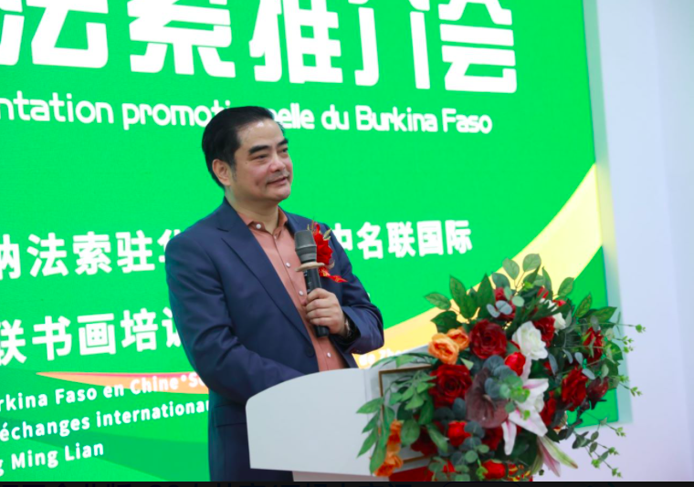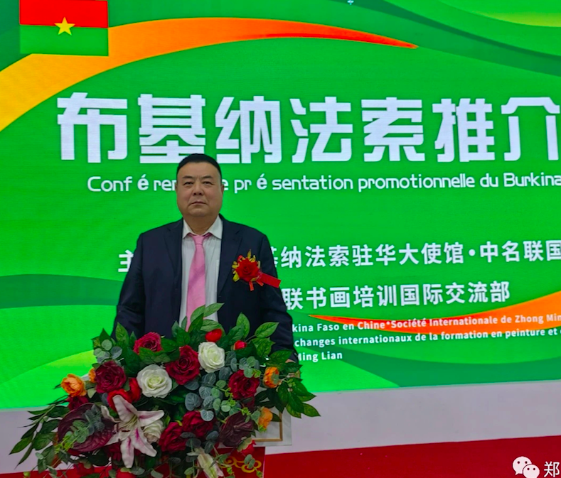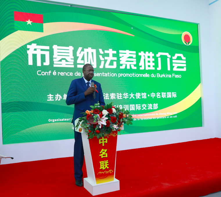 (中名聯文創園圖片說明:布基納法索共和國駐華大使館領導帕爾﹣伊薩﹣約瑟夫先生上臺演講,明確表示非常開心在中名聯國際展廳舉辦布基納法索國家推介會)
