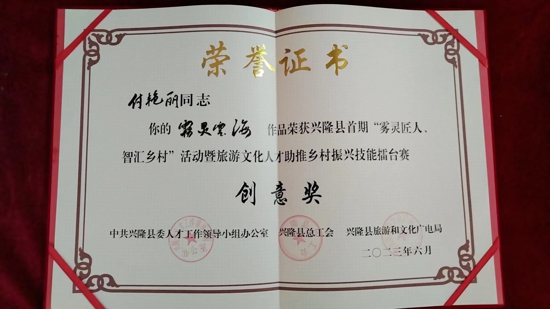 據(jù)了解,此次活動由興隆縣委人才辦、縣總工會、縣旅游和文化廣電聯(lián)合舉辦,興隆縣文化館協(xié)助組織,來自京津冀專業(yè)名家認真評審。全縣入圍的60余件書法美術(shù)、攝影、民間工藝美術(shù)、導游解說等四項共評比“霧靈匠人獎”5名,創(chuàng)意獎10名,優(yōu)秀獎9名。歷時兩個月完美落幕。其中鄭氏砂藝砂畫技師付艷麗作品《霧靈云海》參加了此次評選,并榮獲民間工藝美術(shù)制作競賽類創(chuàng)意獎。