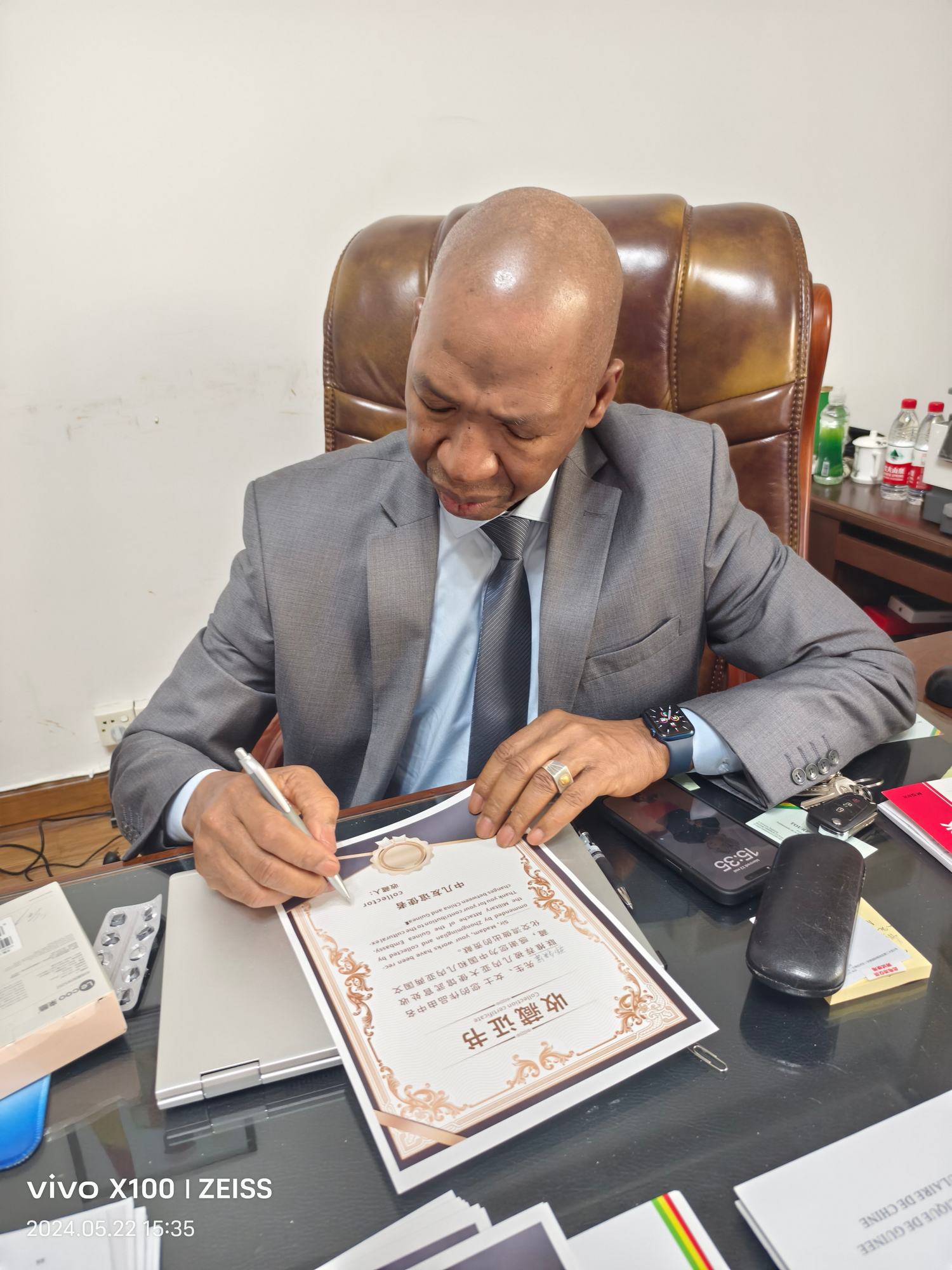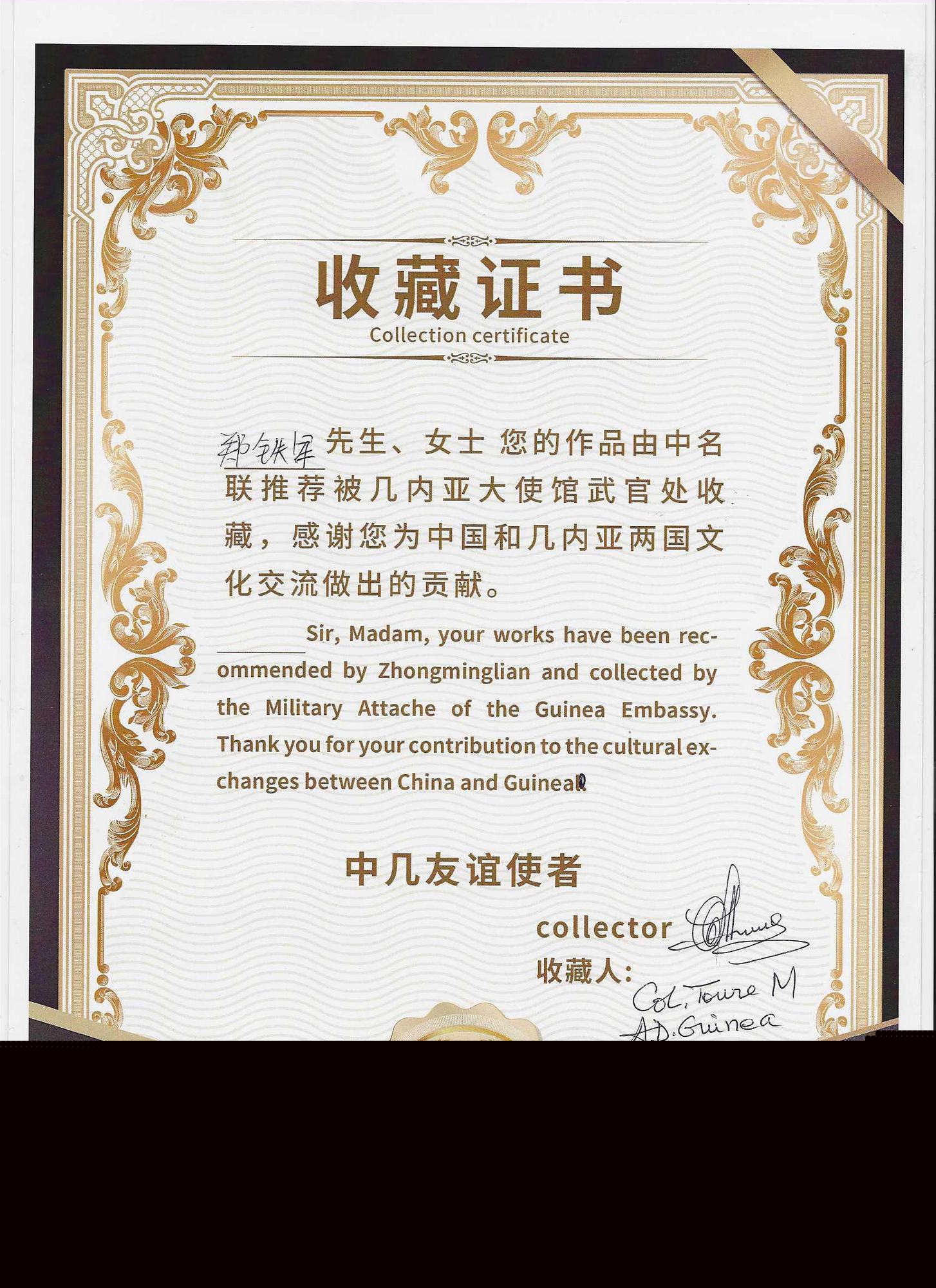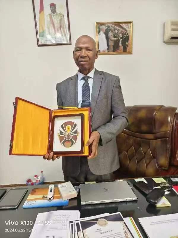 2024年5月22日,經(jīng)幾內(nèi)亞駐華大使誠邀,中名聯(lián)推薦,中名聯(lián)簽約國禮藝術(shù)家鄭鐵軍的砂畫系列作品走進(jìn)幾內(nèi)亞共和國駐華大使館,其中砂畫作品《臉譜》被幾內(nèi)亞駐華大使館作為國禮珍藏,并授予鄭鐵軍中幾文化交流使者榮譽(yù)稱號。