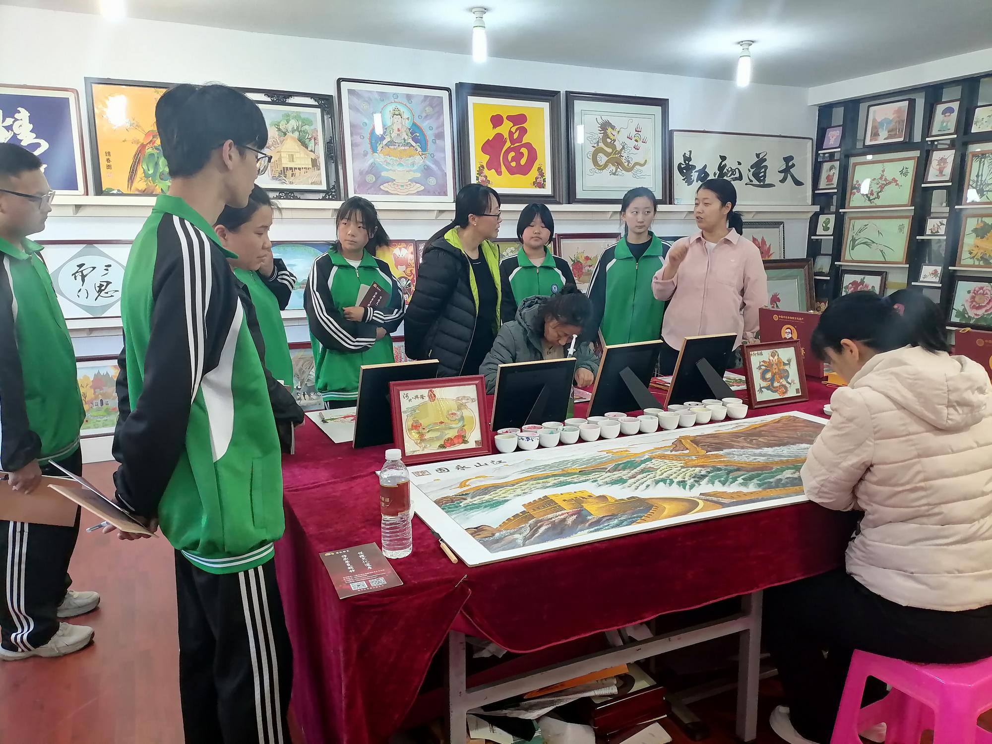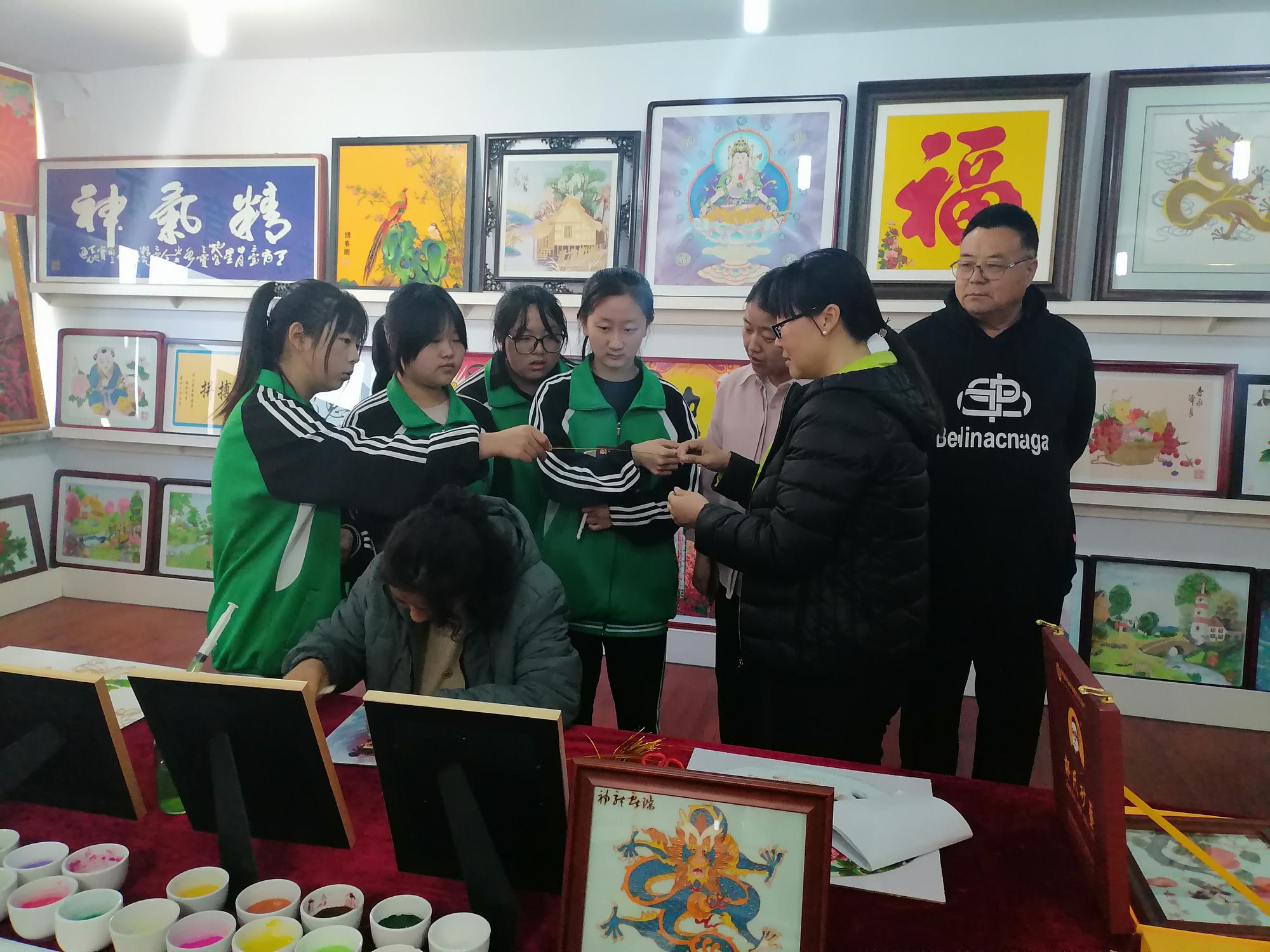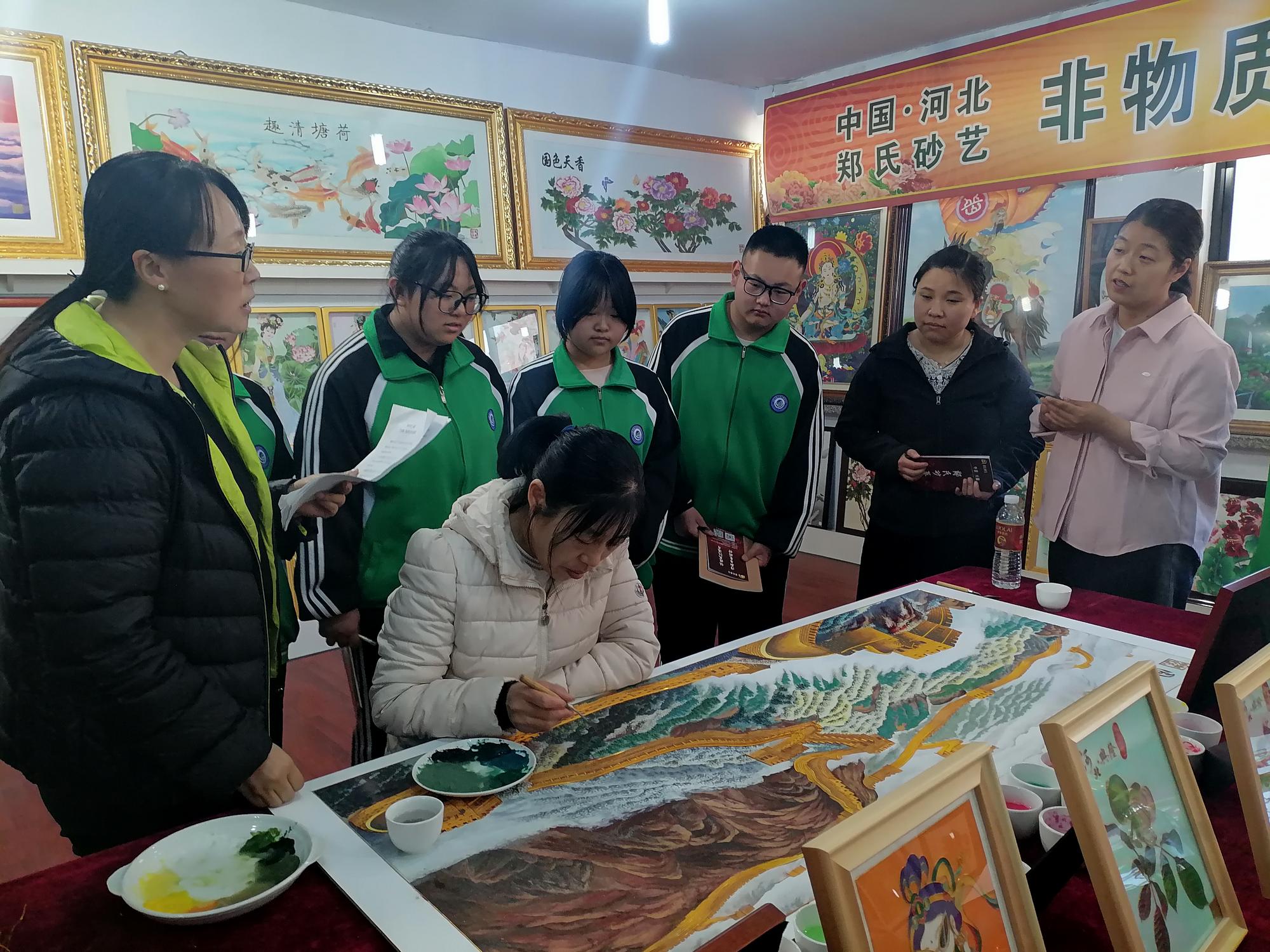 為了更好地向師生們展示砂藝技藝,鄭氏砂藝精心準備了砂藝制作展演,多位砂藝技師分步展演砂藝制作過程,并由河北省勞動模范、非遺傳承技師王鳳艷詳述掐絲勾線、礦物彩砂分層填充等核心工藝要領。學生通過全程觀摩砂畫制作工藝流程,切實領悟"毫厘之間見真章"的工匠精神內涵。當流光溢彩的礦物砂粒與金銀絲線在技師手中逐漸形成美麗的畫面時,展廳內頻現此起彼伏的驚嘆聲。師生們對砂藝作品呈現的現實感染力深感震撼,坦言線上了解遠不及實地體驗深刻。帶隊教師劉贏總結表示:"鄭氏砂藝在非遺傳承中的堅守與創(chuàng)新值得學習,鼓勵大家傳承技師們精益求精的工匠精神,腳踏實地踐行人生目標。"
