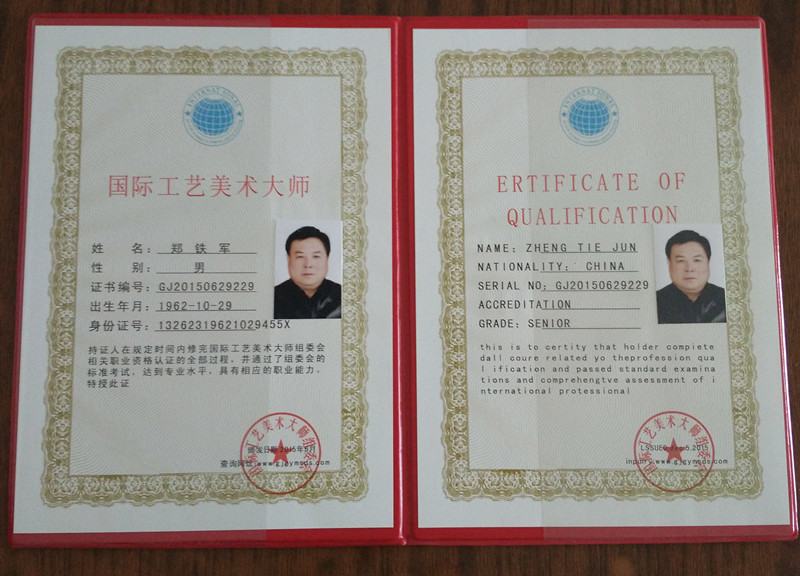 2015年6月,本公司總經(jīng)理鄭鐵軍先生,在規(guī)定時間內(nèi)修完國際工藝美術大師組委會相關職業(yè)資格認證的全部過程,并通過了國際工藝美術大師組委會的職業(yè)資格標準考試,達到專業(yè)水平,具有相應的職業(yè)能力,特授“國際工藝美術大師”稱號。