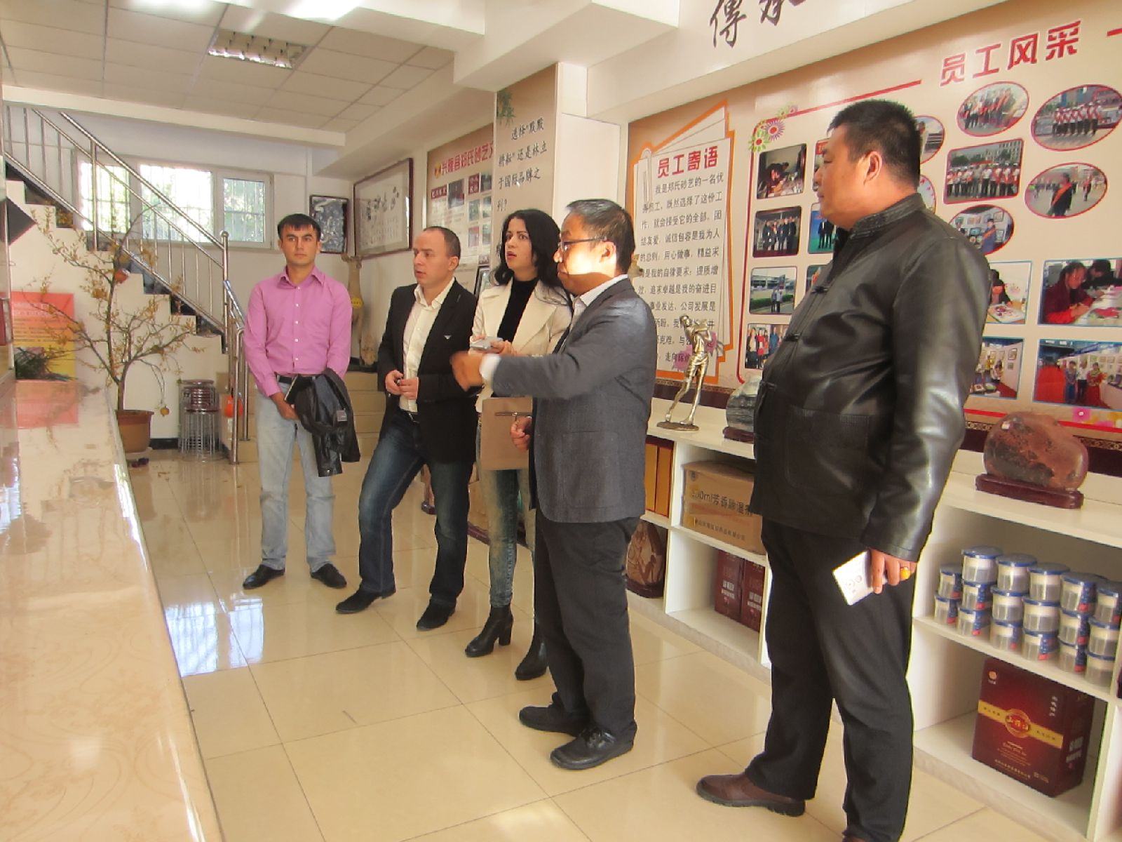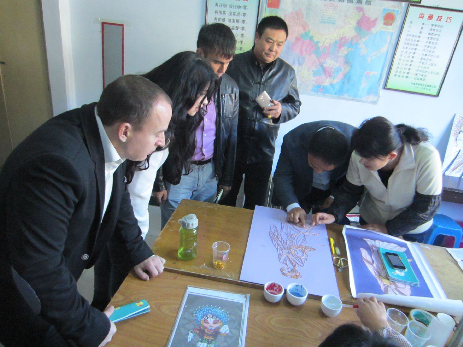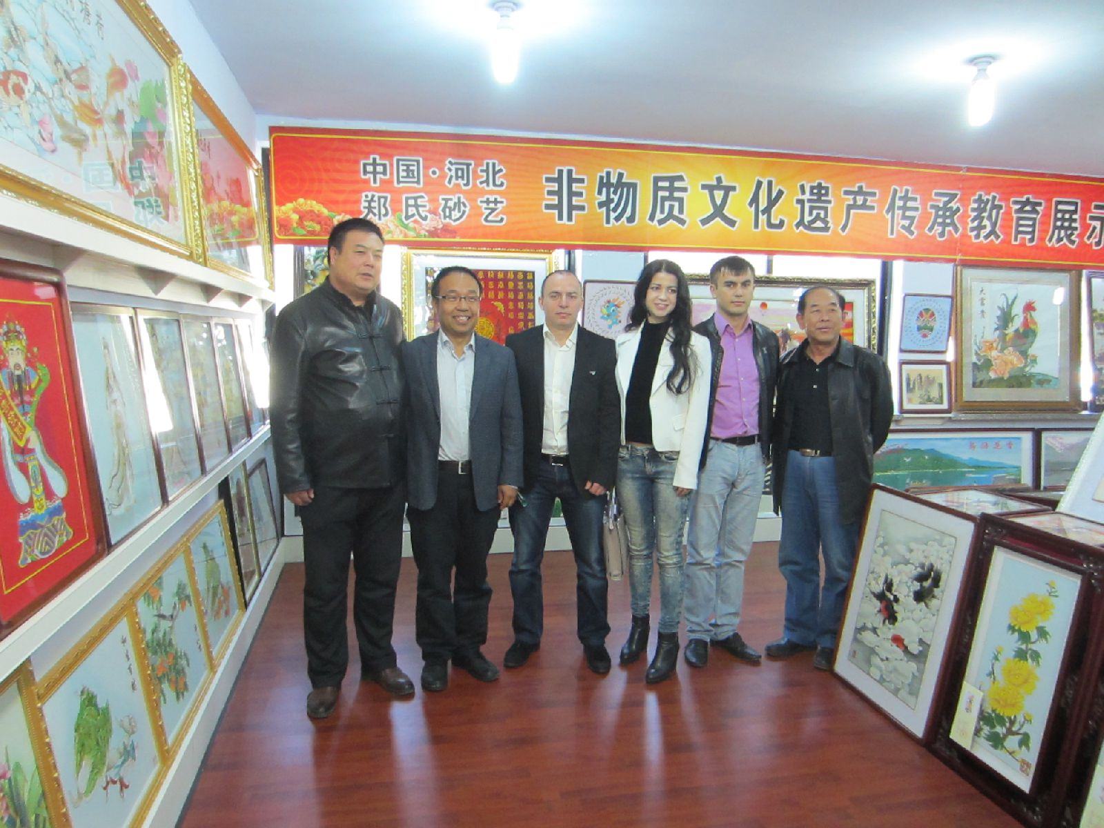 2016年10月17日下午,天津中新天生態城濱海外國語大學董事夢祺兼任英語翻譯率領俄羅斯客商勞拉女士(AURA)、鮑家先生(BURTIA)和阿列克謝先生(ALEXANDRIA)來到興隆縣鄭氏砂藝公司,對鄭氏金銀絲砂畫制作車間、傳統工藝、展廳進行了商務性考察。鄭氏金銀絲砂畫的傳統工藝、精美的做工和豐富多彩的主題畫面,引起了客商們的極大興趣和關注。雙方還就產品交易對接等工作達成了初步意向。