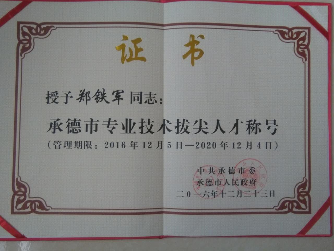 董事長鄭鐵軍榮獲《承德市專業技術拔尖人才》榮譽稱號