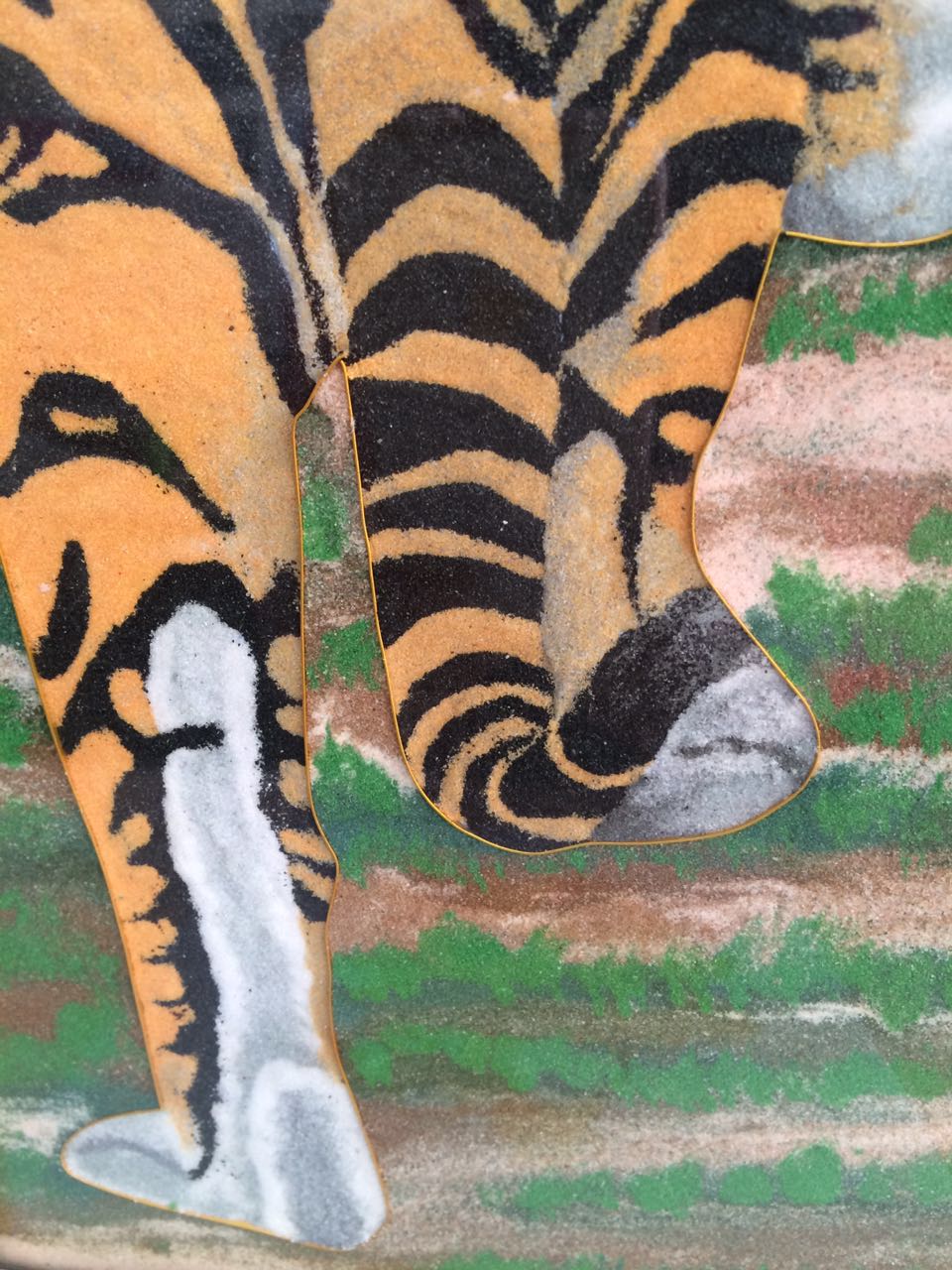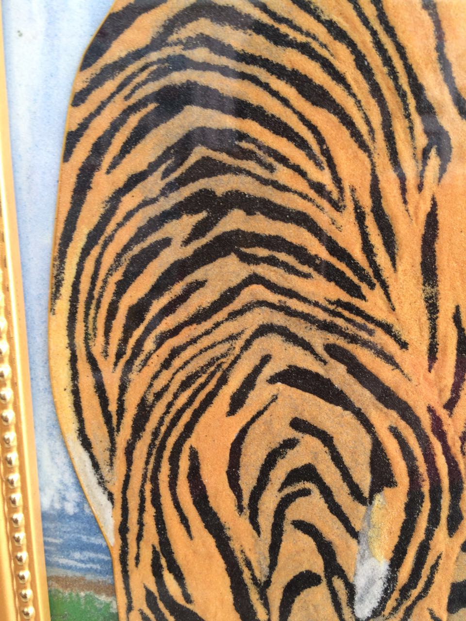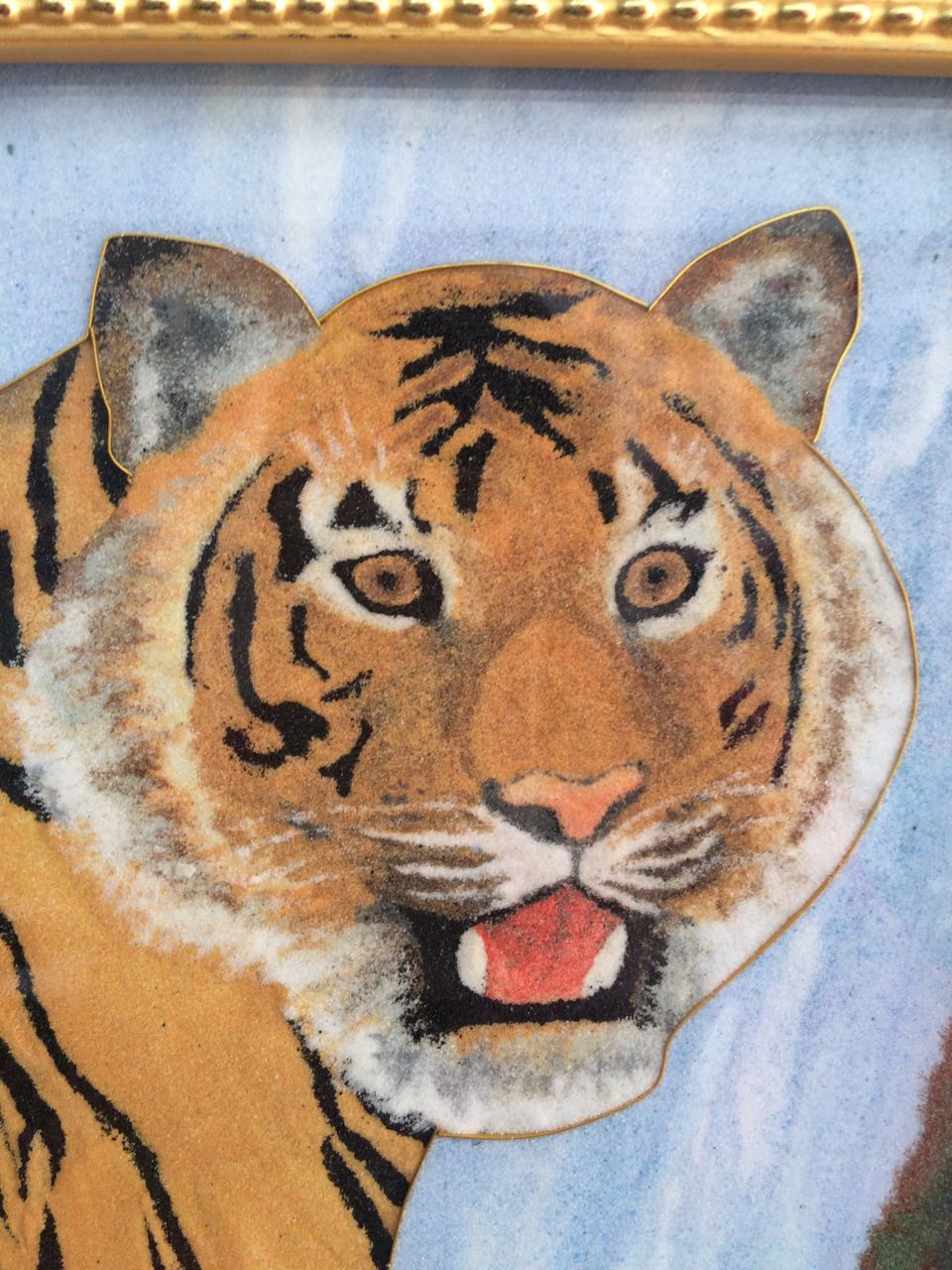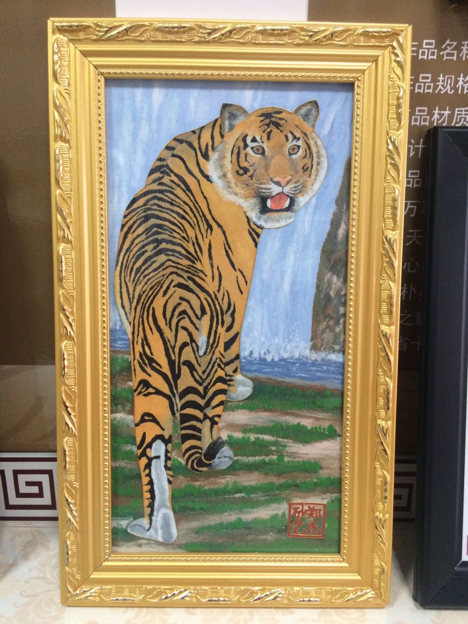 《老虎》28*58*3.5cm(長*寬*高),該產品以老虎作為畫的主題, 老虎屬大型貓科動物;毛色淺黃或棕黃色,滿有黑色橫紋;頭圓、耳短,耳背面黑色,中央有一白斑甚顯著;四肢健壯有力;尾粗長,具黑色環紋,尾端黑色。鄭氏金絲彩砂畫采用金銀絲與彩砂結合,填制出一只威猛的老虎。